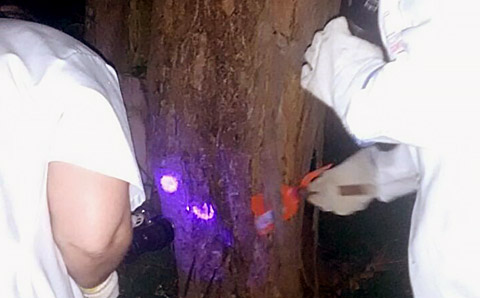 Processo de busca com luz negra, que possibilita a visualização do animal no escuro