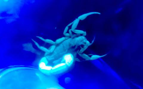 Escorpião amarelo de 5 cm sob luz negra, capturado e encaminhado para produção de soro antiescorpiônico